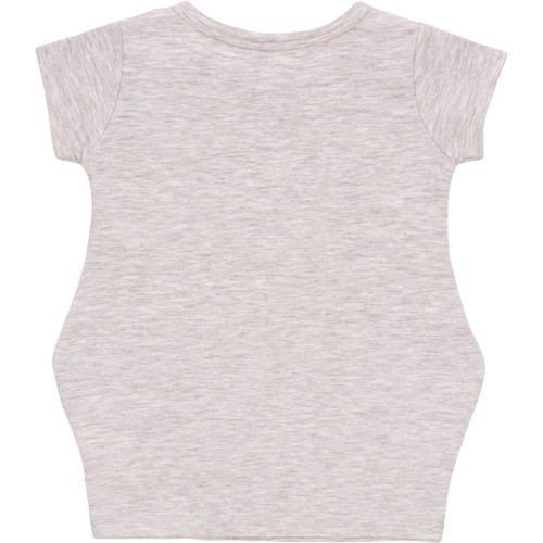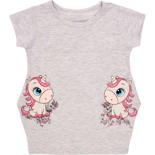 • Симпатична, комфортна меланжева трикотажна сукня-туніка бежевого кольору, з короткими рукавами, прикрашена кольоровими принтовими малюнками двох симпатичних одноріжків спереду, в районі кишень, яка без всяких сумнівів сподобається вашій донечці.