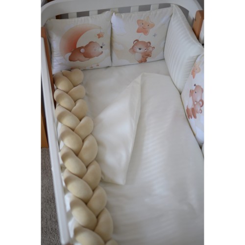 Склад: тканина: страйп сатин/сатин/ранфорс (100% бавовна) наповнювач: ковдра - силіконізоване волокно, подушка, подушки захисту - синтепон, бампер-коса - холлофайбер.