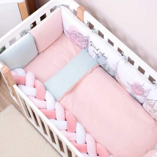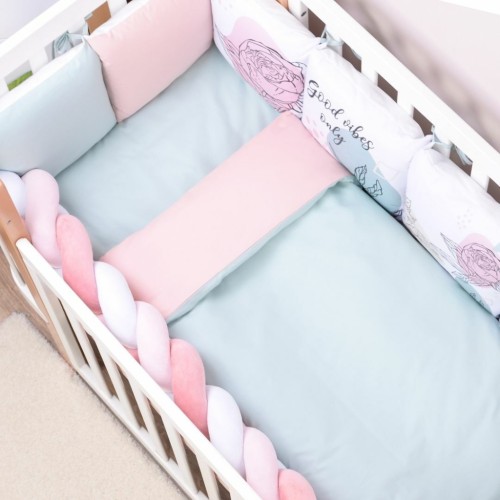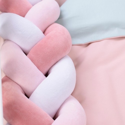 Склад: тканина: велюр/сатин/ранфорс (100% бавовна) наповнювач: ковдра - силіконізоване волокно, подушка, подушки захисту - синтепон, бампер-коса - холлофайбер.