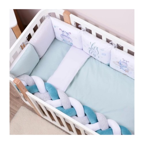 • наповнювач: ковдра - силіконізоване волокно, подушка, подушки захисту - синтепон, бампер-коса - холлофайбер