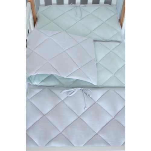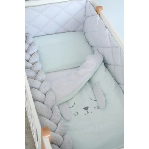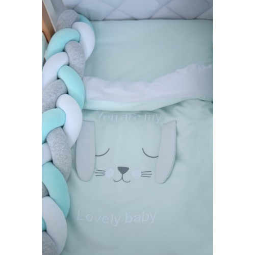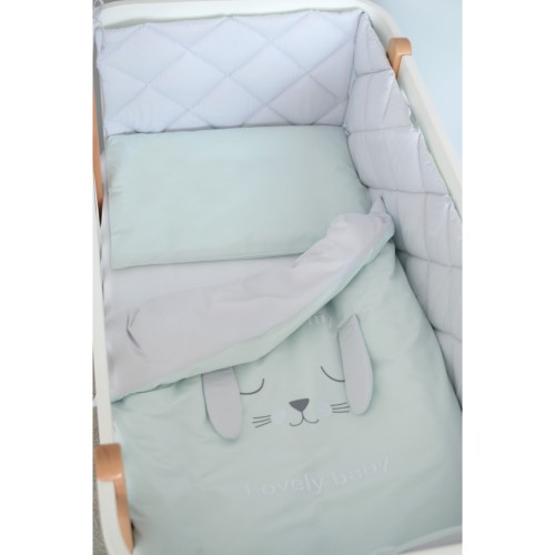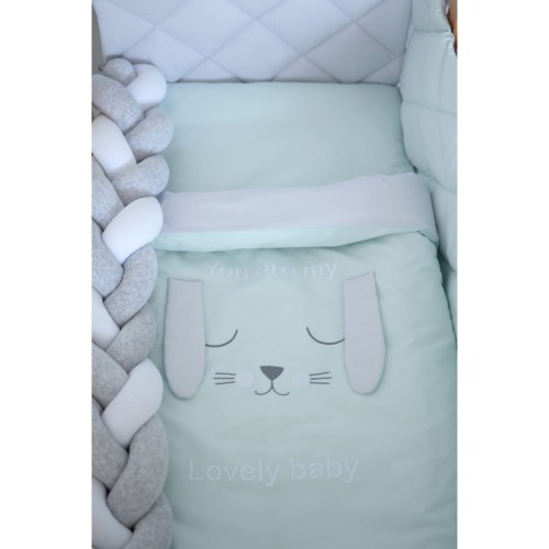 Lovely Baby - стильний стьобаний постільний комплект в дитяче ліжечко з колекції Stich в сіро-ментолових тонах з оригінальною аплікацією мордочка зайчика.