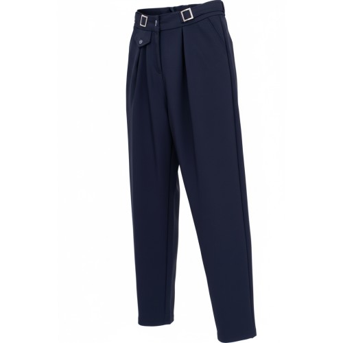 • Штани мають розширений крій зверху, так як зустрічні защіпи додають об'єму в стегнах, та завужені до низу штанини, зручну високу посадку, бокові кишені з похилим входом та вшивний пояс з основної тканини, зібраний на гумку ззаду на спинці.