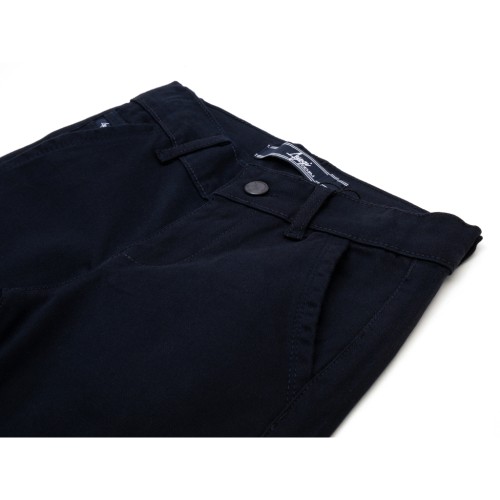 • Штани виготовлені з якісного, щільного стрейчевого котону темно-синього кольору, без утеплення, злегка завужені до низу.