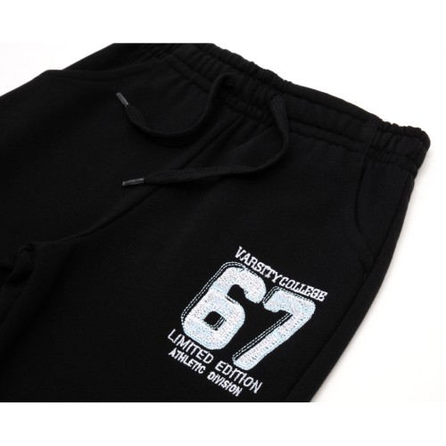 • Зручні, стильні гладко-чорні спортивні штани, на манжетах по низу та під гумку в поясі, зі зручною посадкою, прикрашені спереду стильною кольоровою вишивкою.