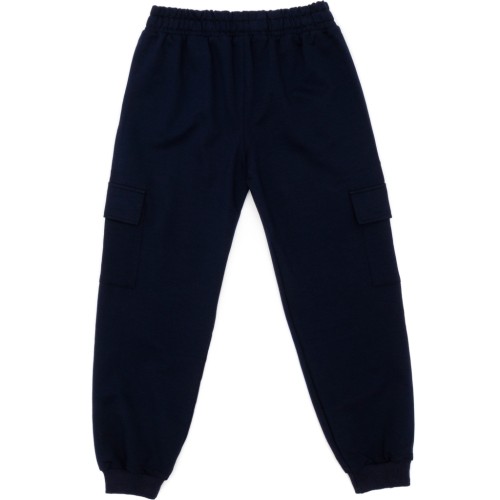 • Зручні, стильні спортивні штани темно-синього кольору з накладними боковими кишенями, з приємного на дотик якісного турецького трикотажу (77% бавовна).