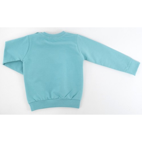 Затишний вільний світшот красивого м'ятного кольору прямого силуету з довгими рукавами. Прикрашений спереду красивим принтовим малюнком ведмедика та написами.