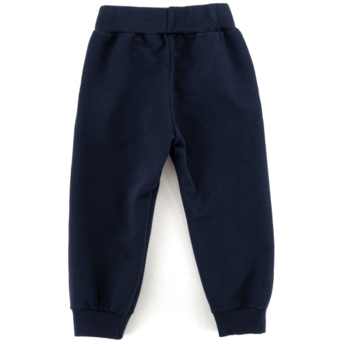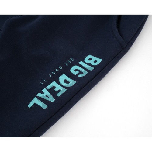 Зручні штани темно-синього кольору, внизу на манжетах, із двома прорізними кишенями, так само прикрашені на лівій штанині принтовим написом «BIG DEAL».