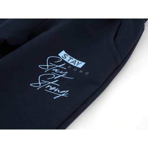 Зручні вільні штани темно-синього кольору, внизу на манжетах, з двома прорізними кишенями, прикрашені на лівій штанині такими ж написами як і на кофті.