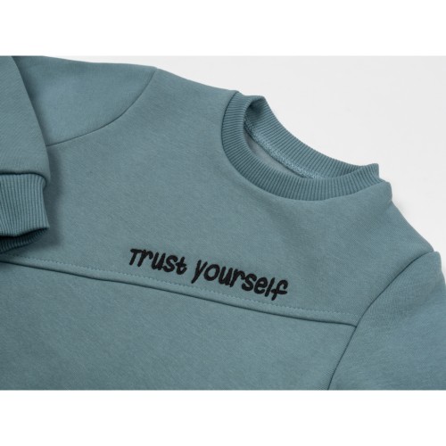 • Затишний, стильний світшот кольору темної м'яти, під гумку по низу та з довгими вшивними рукавами. Манжети рукавів, горловина та лінія низу оброблені подвійною, якісною, щільною трикотажною «гумкою». Прикрашений спереду на грудях акуратним вишитим написом та стильною нашивкою.