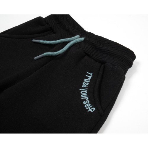 • Зручні, гладко-чорні, не широкі штани на манжетах, з двома прорізними кишенями та еластичним широким трикотажним поясом з подвійної трикотажної «гумки», забезпечать комфорт при носінні та оптимальну посадку по фігурі. Штани прикрашені біля входу в кишеню контрастною акуратною вишивкою. В поясі є круглий, функціонуючий шнурок з пластиковими накінечниками.