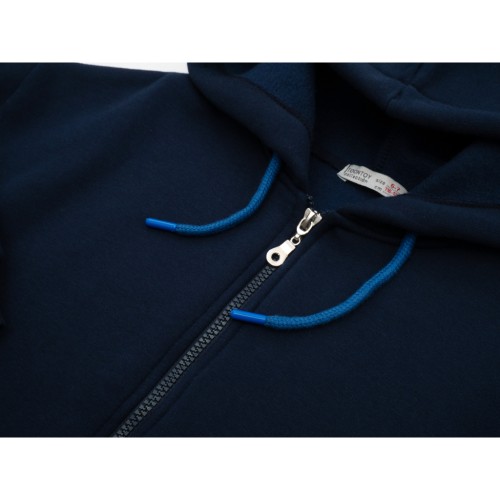 • Модний, дуже ефектний, зручний та теплий темно-синій вільний спортивний костюм з каптуром, прикрашений кольоровими принтовими накатами та фірмовою нашивкою від тм Toontoy: кофта-олімпійка з каптуром та штани на манжетах.