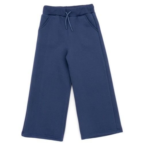 • Модний, ефектний трикотажний костюм на флісі для дівчинки виконаний в кольорі індиго: вільний світшот і прямі широкі штани-палаццо.