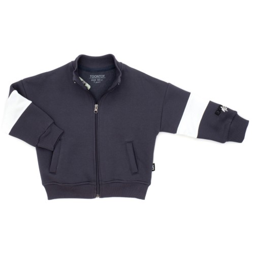 • Модненький, зручний та теплий трикотажний сірий спортивний костюм на флісі з контрастними кремовими вставками та вишивкою на рукаві для хлопчика від тм Toontoy: кофта-олімпійка та штани на манжетах.