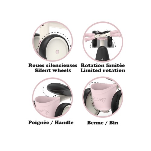 Зробивши свої перші кроки, малюк з легкістю може сісти за кермо 4-х колісного біговела "Мінні Маус. Роккі" від Smoby. Він має міцну металеву раму та широкі стійкі колеса. Стилізований біговел ліцензією Disney Minnie Mouse. Ергономічне сидіння та кермо, з обмеженим поворотним радіусом і покриттям проти сковзання, зроблять керування комфортним та безпечним. Колеса виготовлені з м'якого матеріалу EVA, що робить їх безшумними та стійкими до зносу. Завдяки протекторам на колесах, біговел надійно зчеплюється з дорогою. Перебираючи ногами на біговелі, дитина отримує фізичні навантаження, що сприяє її розвитку. А для більш веселої подорожі візьми свого іграшкового друга з собою та посади його у кошик позаду сидіння. Коли малюк накатався та хоче прогулятись, біговел зручно переносити завдяки ручці, розташованій під сидінням.