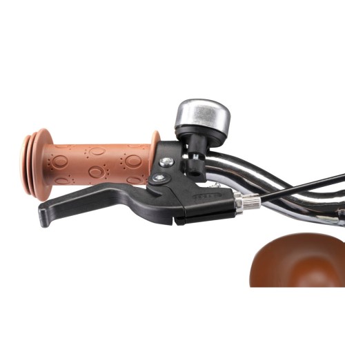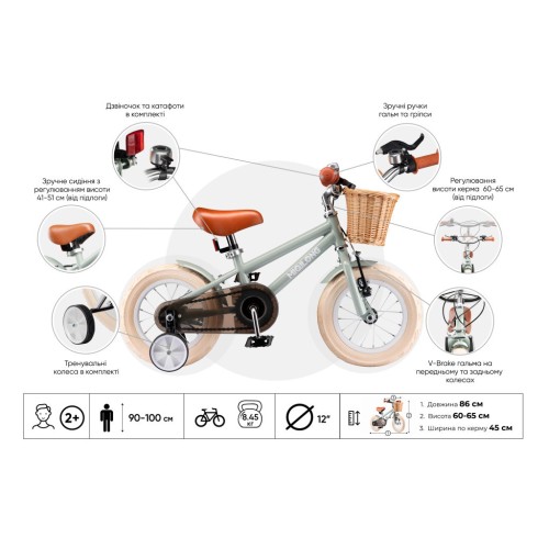 Кермо і сидіння регулюються по висоті в широкому діапазоні. Сидіння м'яке, з покриттям з ECO-шкіри. Гріпси керма м'які гумові, з бічним захистом рук при падінні. Ручне гальмо V-Brake на передньому і ножні гальма на задньому. Подібна комбінована схема, де для гальмування заднім колесом потрібно натискати на педалі в зворотному напрямку, дозволить маленькій дитині легше освоїтися. Так як самим маленьким дітям буває складно користуватися ручним гальмом.