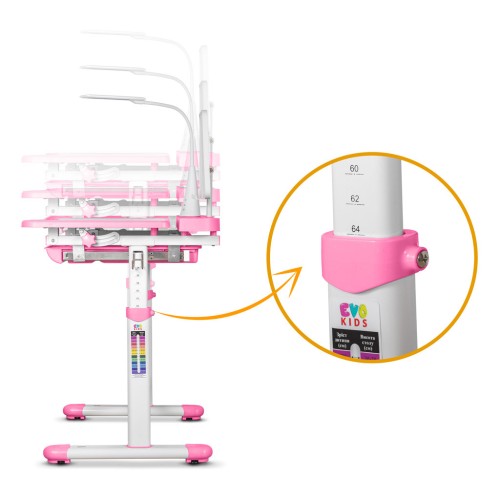 Висота парти змінюється ступенево та фіксується гвинтами з обох боків. На ніжках розміщена шкала співвідношення зросту дитини та висоти столу, що допоможе під час регулювання.