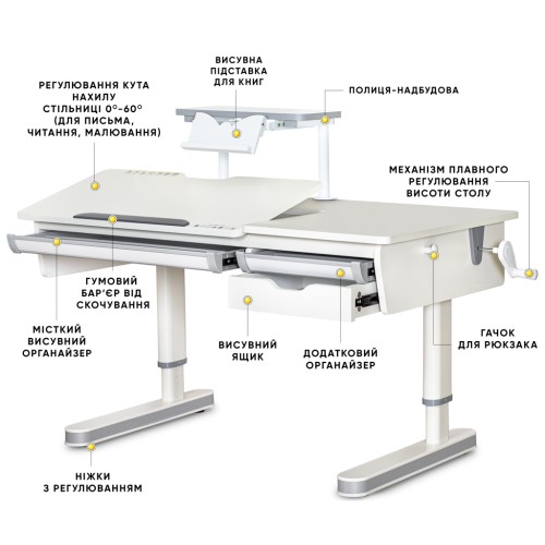 Стільниця змінює кут нахилу до 60 градусів, її можна використовувати для малювання, як мольберт. Плавність регулювання забезпечує газліфт. Спеціальний зазор для пальців дозволить безпечно регулювати стільницю навіть маленьким дітям. На стільниці передбачений прогумований бар'єр від скочування предметів під час занять. З обох сторін столу розміщені гачки для портфеля чи спортивної форми. Металеві ніжки доповнені спеціальними меблевими регулювальними опорами для забезпечення його стійкості.