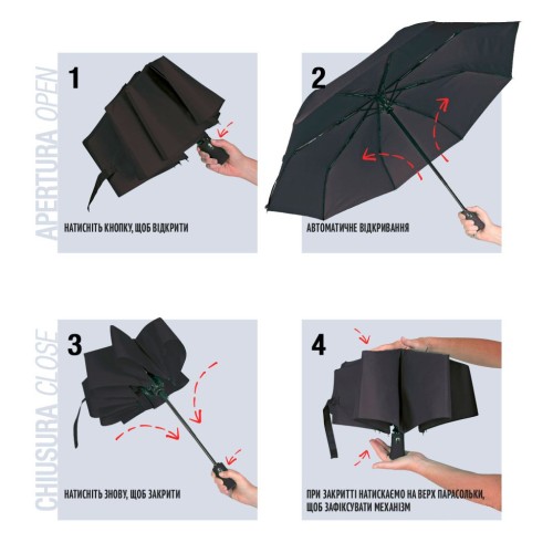 Автоматичне відкриття та закриття дозволяє користуватися парасолькою однією рукою. Ергономічна прогумована ручка має приємну на дотик поверхню.