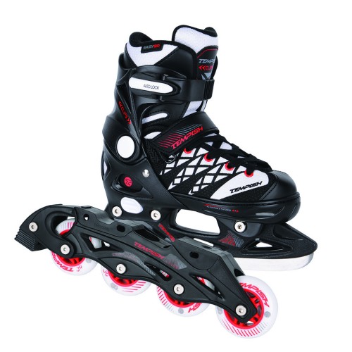Tempish Clips Duo - дитячі ковзани для хлопчиків, призначені для початківців і просунутих ролерів і фігуристів. Конструкція системи дозволяє замінити крижане лезо на колісне шасі і навпаки, що робить цю модель практичною в будь-який час року. Clips Duo виконані з морозостійкого пластика TPU, PVC і NYLON + NYLEX, що робить їх стійкими до температури аж до -20 °C.