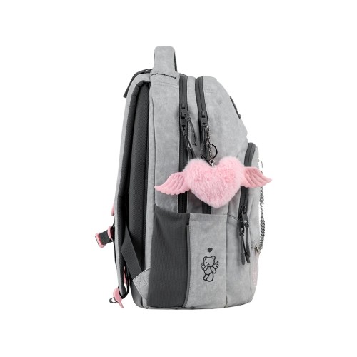 • декор: тканина - твіл з ефектом потертості; об'ємна вишивка; об'ємний друк; знімний металевий ланцюжок; м'який брелок-підвіска у формі серця з крильцями на металевому карабіні.