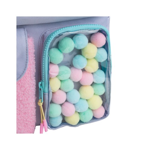 • декор: м'яка кишеня із теді-плюша, прозора PVC кишеня з декоративними помпонами, об'ємний друк, металеві люверси, об'ємна вишивка, брелок-підвіска з комбінованих матеріалів