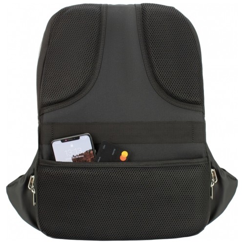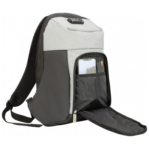 Розмір: 44*31*14 см. Конструкція з системою Anti-Theft проти крадіжок з кодовим замком. Матеріал: поліестер з PU покриттям на передній кишені та по боках; зовнішній USB порт; знімний брелок для ключів; анатомічна спинка з м'якими вставками; Laptop-кишеня та кишеня для планшета; 1 відділення на блискавці; 1 передня кишеня, прихована кишеня на спинці, окрема кишеня для Power bank, органайзер; металева фурнітура, подвійні застібки; міцна ручка; спинка ущільнена PE вставкою; ергономічні S-подібні регульовані лямки.