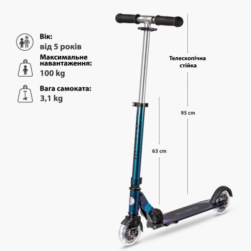 Самокат MICRO серії "Sprite LED" - досконалий та міцний двоколісний самокат. Він оснащений колесами, що світяться, та складною рамою.