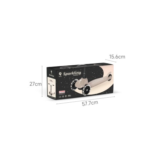 Самокат оснащений зручним механізмом складання одним натисканням, що дозволяє легко транспортувати та зберігати його. Регульована висота керма дає змогу адаптувати самокат під зріст дитини та використовувати його протягом кількох років. Нековзна платформа з блискітками гарантує комфортну та безпечну їзду, а заднє ножне гальмо забезпечує надійне та швидке гальмування.