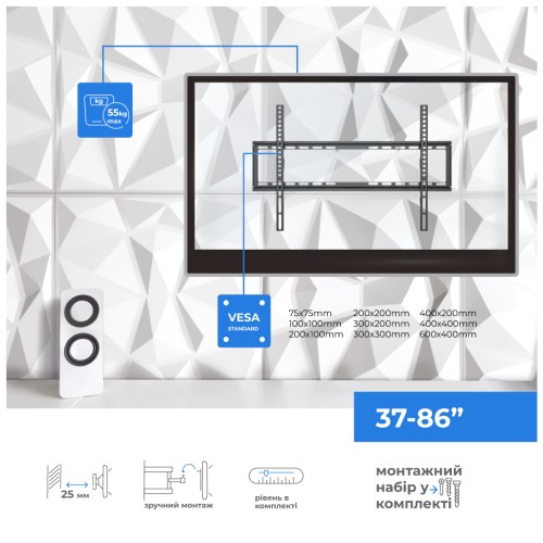 Кронштейн підтримує VESA стандарти: 75x75 мм, 100x100 мм, 200x100 мм, 200x200 мм, 300x200 мм, 300x300 мм, 400x200 мм, 400x400 мм, 600x400 мм, що забезпечує можливість встановлення практично будь-якого сучасного телевізора.