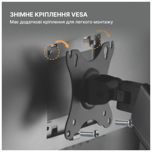 Організуйте порядок на робочому столі за допомогою системи прихованого укладання кабелів. Завдяки спеціальному пружинному механізму з регулюванням самостійно налаштовуйте оптимальну позицію монітора, регулюючи нахил до 90°. Це підвищить зручність роботи, зменшить навантаження на очі та м'язи шиї. Розмір кріплення становить 117 x 480 x 570 мм.