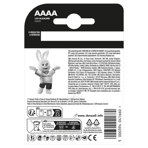 Спеціальні лужні батарейки Duracell AAAA — це довговічна енергія для ваших охоронних пристроїв. Спеціальні лужні батарейки Duracell мають гарантію зберігання до 5 років, тому ви можете бути впевнені, що ці батарейки будуть готові до використання, коли вам це буде потрібно. Вони підходять для використання в цифрових ручках, медичних пристроях і налобних ліхтарях.