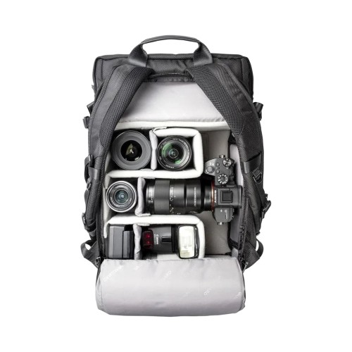 Елегантний зовнішній вигляд поєднується з міцним захистом, і сумка легко захистить бездзеркальну/CSC/гібридну камеру з прикріпленим об'єктивом, 2-3 додаткові об'єктиви, спалах та аксесуари. Крім того, вона також може вмістити невеликий професійний дрон або бездзеркальну/CSC/гібридну камеру з відеообладнанням (підвіс, аудіокомплект, освітлення тощо). Початкова конструкція перегородок сконфігурована як рюкзак, причому верхня третина доступна через отвір на блискавці. Однак перегородки можна легко налаштувати для повного використання обладнання та легкого доступу до камери зверху. Відповідайте своїм уподобанням у робочому процесі за допомогою ієрархічної конфігурації, використовуючи численні перегородки та кілька точок доступу.