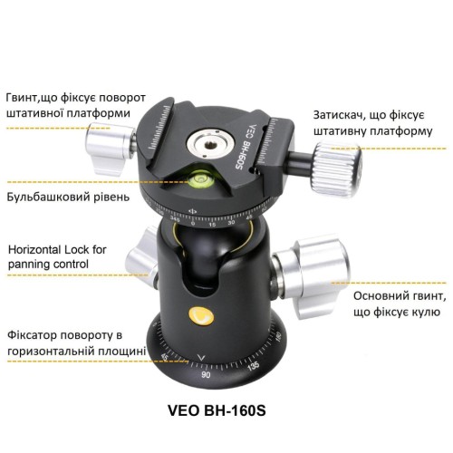 Кульова головка VEO BH-160S сумісна зі стандартом кріплення Arca Swiss, дозволяє використовувати будь-яку швидкознімну штативну платформа, сумісну з Arca Swiss. Головка має чотири ергономічних гвинти, що дозволяють налаштувати і зафіксувати оптичний прилад чітко горизонтально чи вертикально, незважаючи навіть на значні нерівності грунту. Як на самому штативі, так і на голівці знаходиться бульбашковий рівень, що дозволяє встановити штатив точно паралельно горизонту.