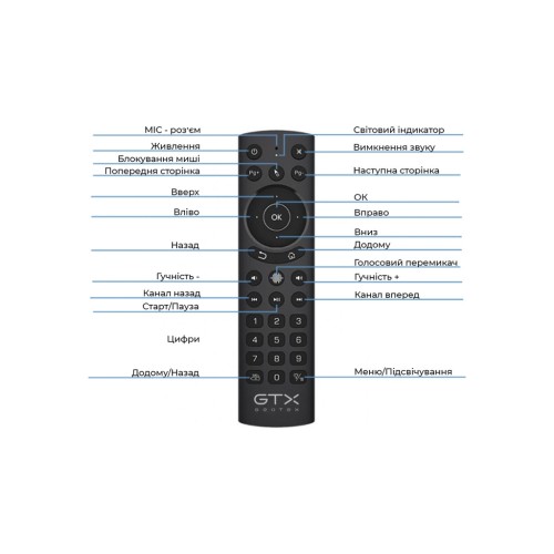 Пульт Geotex G20S Pro Voice Control – аеромиш з ультрачутливим гіроскопом (6-осьовий гіроскоп), голосовим введенням та підсвічуванням клавіатури. Підсвічування клавіатури автоматично вимикається при знаходженні пульта у спокої понад 20 секунд і автоматично спрацьовує при натисканні на будь-яку кнопку. Примусово вимкнути підсвічування можна кнопкою, яка знаходиться під 9 з іконкою лампочки, затиснувши її на 5 секунд.