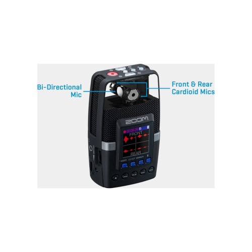 Завдяки двом кардіоїдним мікрофонам, спрямованим спереду і ззаду, а також двоспрямованому мікрофону, спрямованому по боках, H2essential дозволяє вибрати ідеальну схему звукозапису для будь-якої задачі.