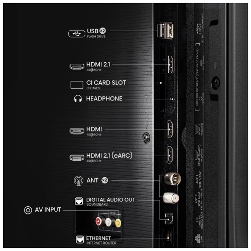 3 x HDMI; Headphone; 1 x RJ-45; 2 x USB; CI; 2 x Супутниковий вхід; S/PDIF; Аудіовихід; 1 x AV IN
