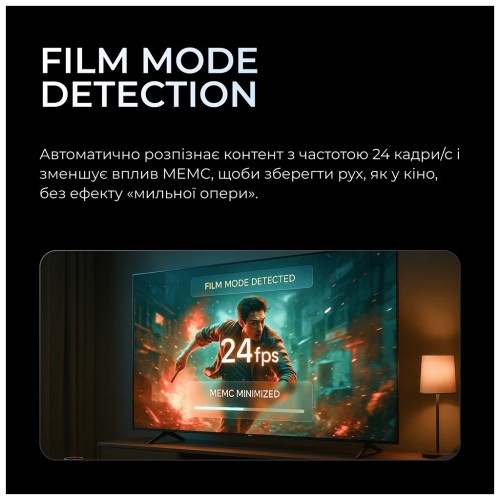 Плавність динамічних сцен забезпечується інтерполяцією 60 Гц, а підтримка Dolby Vision, HDR, HLG і 4K Upscaling дозволяє насолоджуватися високою деталізацією та контрастом у будь-якому контенті.