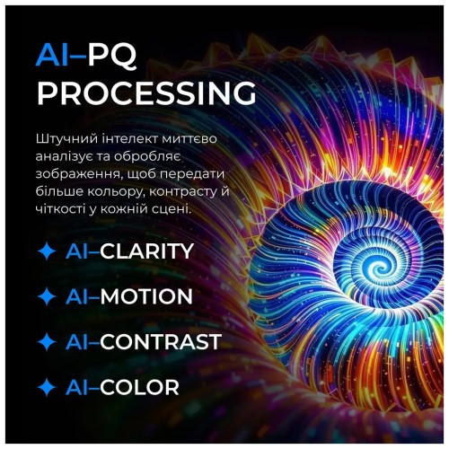 Широкий кут огляду 178°/178° та контрастність 1700:1 гарантують стабільну якість зображення незалежно від позиції глядача. Підтримка технологій Dolby Vision, HDR, HLG і 4K Upscaling забезпечує глибші тіні, яскравіші відтінки та покращену деталізацію навіть у контенті з нижчою роздільною здатністю.