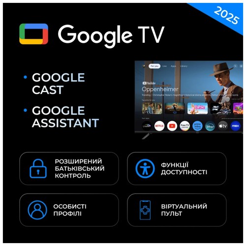 Телевізор працює на платформі Google TV, надаючи повний набір Smart-можливостей: Google Cast, голосове керування, керування зі смартфона, доступ до популярних стрімінгових сервісів і тисяч додатків.