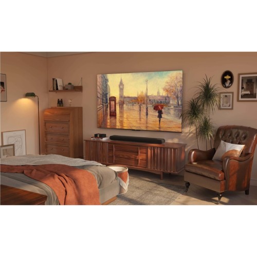 Аудіосистема з підтримкою технології Dolby Audio створює ефект об’ємного звучання, яке заповнює кімнату, дозволяючи зануритися у події на екрані. Дизайн телевізора вирізняється мінімалізмом і тонкими рамками, що робить його не лише функціональним пристроєм, але й стильним елементом декору, який пасує до будь-якого сучасного інтер'єру.