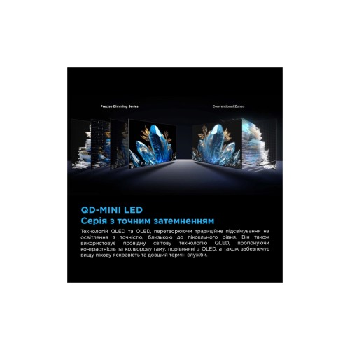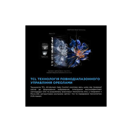 Телевізор TCL 65C6K - це справжній витвір мистецтва в світі технологій. Велика 65-дюймова діагональ з роздільною здатністю 3840 x 2160 пікселів та матрицею MiniLED створює приголомшливий візуальний досвід. Завдяки технології QD-Mini LED, телевізор поєднує в собі переваги QLED та OLED, забезпечуючи надзвичайну контрастність та широку кольорову гаму, яка перевершує очікування.
