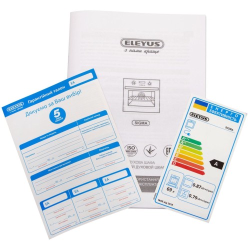 Панель керування духової шафи виготовлена з надійної та довговічної емальованої сталі, а дверцята – з подвійного гартованого скла, яке легко витримує високі температури. ELEYUS SIGMA 6006 гармонійно поєднається з інтер’єром завдяки своєму сучасному стилю.