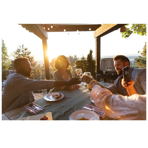 Завдяки відсутності деревного вугілля, газу чи полум'я електропіч безпечно використовувати на терасах, природі та інших відкритих просторах. Першокласні матеріали є стійкими до погодних умов, пристрій виготовлено з урахуванням британської погоди. Очищайте пристрій із антипригарними елементами.