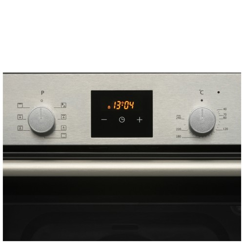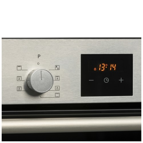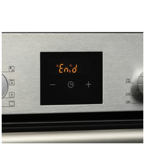 Необхідності запам'ятовувати час постановки дека в духовку і вираховувати, як довго вже готується страва, більше немає. Пара дотиків до сенсорних клавіш – і ви вже задали необхідний час приготування: по його закінченні духовка автоматично вимкнеться. Показання таймера відображаються на великому LED-дисплеї, розміщеному на панелі управління. За перемикання програм і установку температури відповідають дві ергономічні механічні ручки. Для включення духовки просто поверніть їх в потрібне положення, направивши покажчики на піктограму режиму і значення необхідної температури.