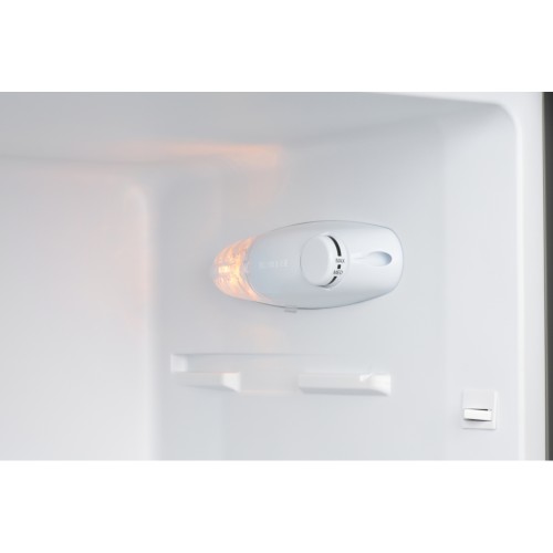 В холодильному відсіку є три основні полиці і три полиці на дверях, а також фреш-зона для зберігання делікатних продуктів, овочів та фруктів. Внутрішнього простору вистачить для достатньої кількості свіжих продуктів, баночок, напоїв та заморозки. У морозильній камері, яка розташована зверху, встановлена полиця-решітка, яка розділяю камеру навпіл.