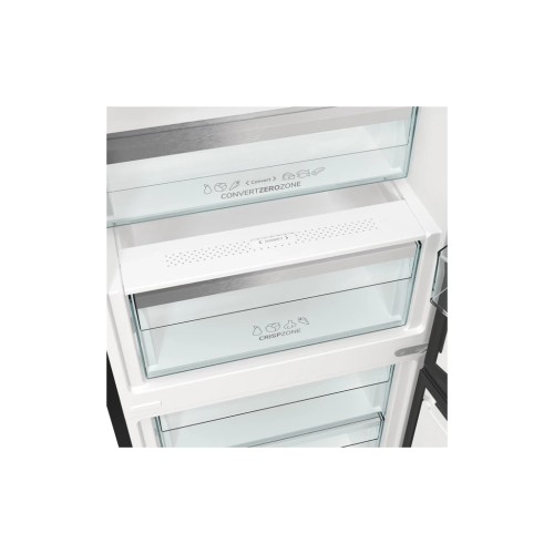 Система повного No Frost у холодильному та морозильному відділеннях підтримує сухе охолодження без утворення інею та необхідності ручного розморожування. Корисний об’єм холодильної камери становить 253 літри й включає 4 скляні полиці, зручні дверні кошики, ящик CrispZone для овочів і фруктів, а також контейнер ZeroZone для зберігання м’яса та риби при зниженій температурі. Технології Metal Cooling та Multi Air Flow забезпечують рівномірний розподіл холодного повітря й стабільну температуру у всьому внутрішньому просторі.