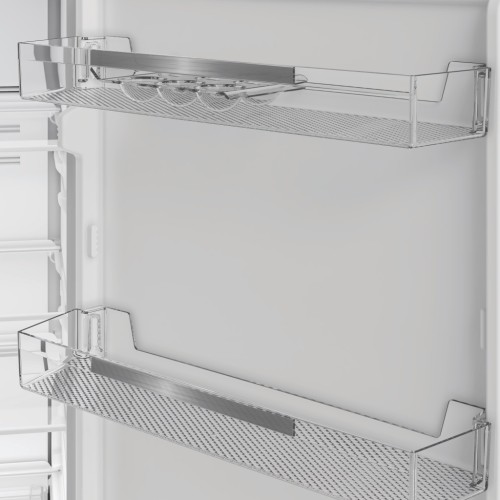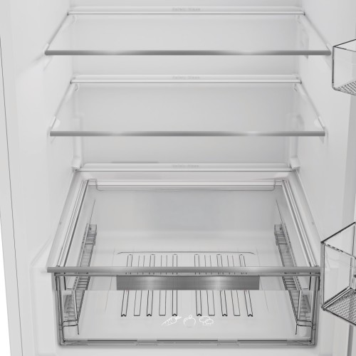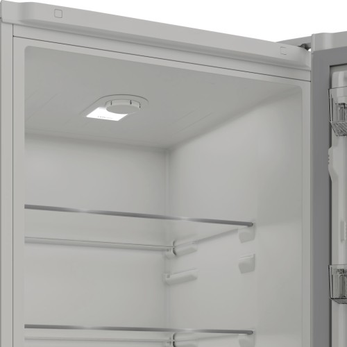Холодильна камера обладнана п’ятьма скляними полицями, чотирма дверними кошиками та контейнером для овочів і фруктів, що гарантує продуману організацію простору. LED-освітлення створює м’яке й рівномірне підсвічування, завдяки якому всі продукти добре видно навіть у темряві.