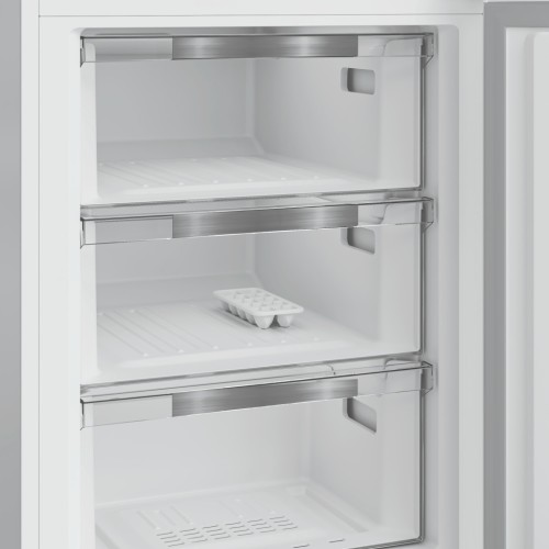 Загальний об’єм становить 386 літрів, з яких 266 л припадає на холодильне відділення, а 120 л — на морозильну камеру. Такий простір ідеально підходить для родини, адже дозволяє зручно розмістити всі продукти. Система статичного охолодження підтримує стабільну температуру в обох відділеннях, а нижнє розташування морозильної камери забезпечує легкий доступ до свіжих продуктів.
