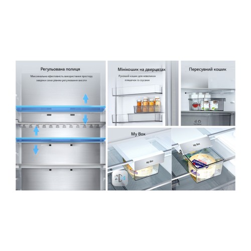 led-освітлення; технологія контролю напруги; експрес заморозка; антибактеріальний ущільнювач bio shield; перенавішування дверей; сигнал відкритих дверцят; багатопотокова система охолодження multi air flow; нульовий зазор; металеве декорування полиць та ящиків; режим економії електроенергії eco friendly; винна полиця; doorcooling+; лоток для заморожування льоду; металева задня стінка metal fresh; міні кошик на дверцятах; пересувний кошик; висувний контейнер для дрібної їжі my box; складана полиця; lg thinq з керуванням через wi-fi; інтелектуальна система діагностики smart diagnosis; кришка для підтримки оптимальної вологості