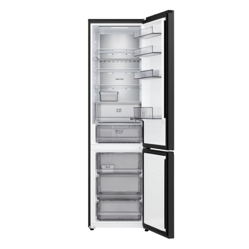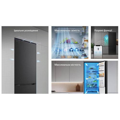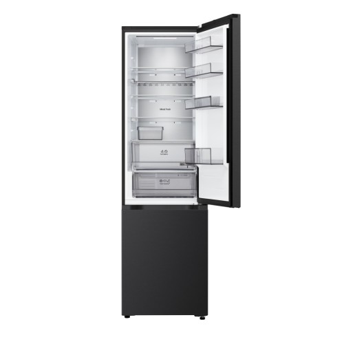 Холодильник LG GC-B509ETSM з нижньою морозильною камерою має корисний об’єм 375 л (262 л холодильне + 113 л морозильне відділення) і належить до енергетичного класу E. Інверторний компресор забезпечує рівень шуму 35 дБ та потужність заморожування 10 кг на добу. Система Total No Frost усуває необхідність розморожування, а Metal Fresh разом із зонами Fresh Converter та Fresh Balancer підтримують оптимальні умови для різних продуктів. Матове чорне покриття корпусу та прихована горизонтальна ручка створюють стриманий сучасний вигляд.